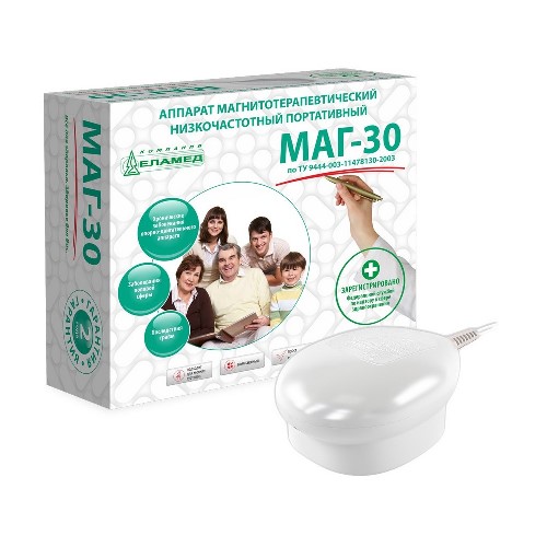 Аппарат МАГ-30 предназначен для оказания терапевтического воздействия на организм человека переменным неоднородным магнитным полем, можно применять в медучреждениях и домашних условиях. При воздействии низкочастотным магнитным полем аппарата МАГ-30 отмечается хорошая переносимость у ослабленных больных, больных пожилого возраста, страдающих сопутствующими заболеваниями сердечно-сосудистой системы; больных, склонных к аллергическим реакциям на медикаменты.