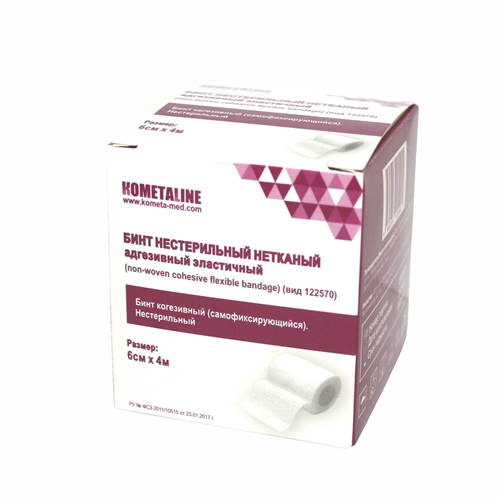Бинт медицинский эластичный фиксирующий не липнет к коже, одежде и волосяному покрову, фиксируется к предыдущему витку, не требует завязывания, не вызывает раздражения. Применяется для перевязок всех типов.